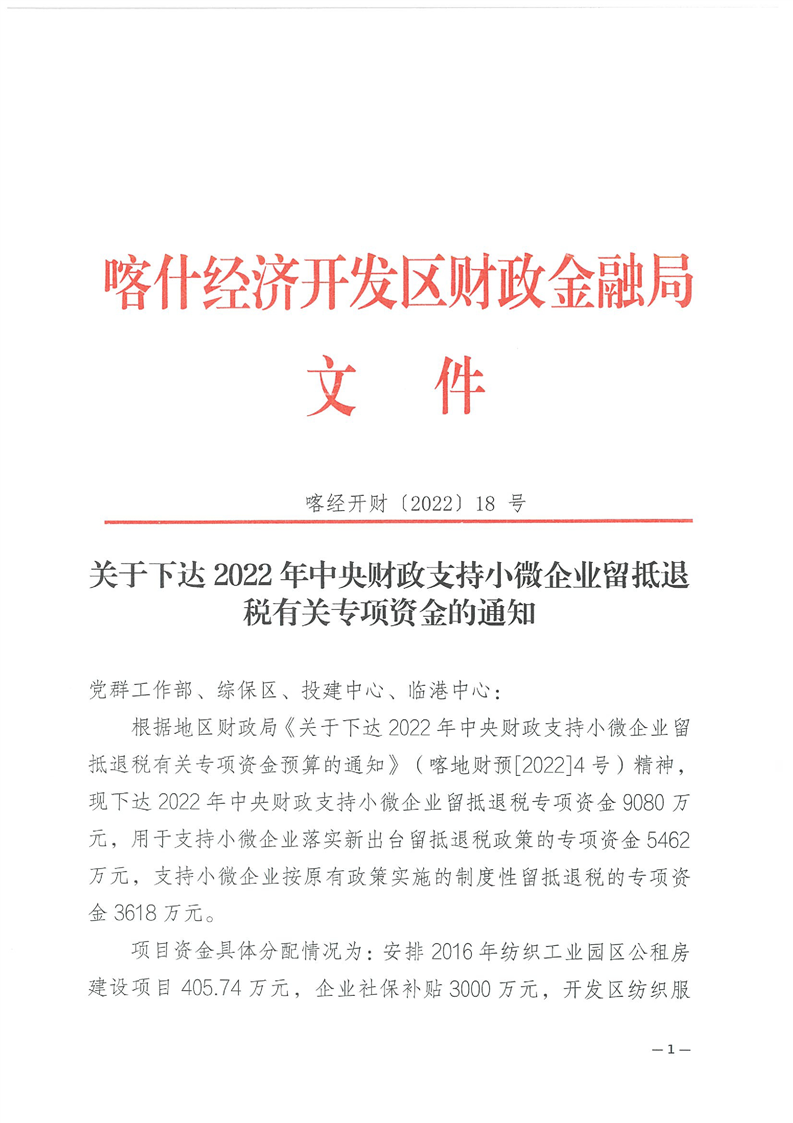 關于下達2022年中央財政支持小微企業留抵退稅有關專享資金的通知
